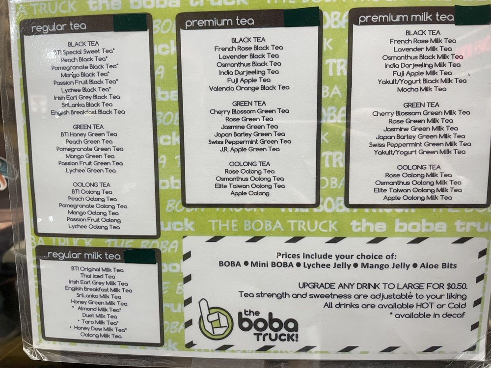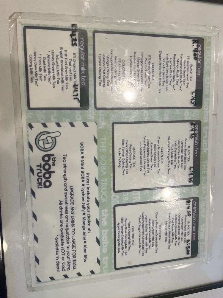 Introducing the menu at The Boba Truck, located in Northridge, CA, where they offer a variety of Taiwanese specialties. From the flavorful Taiwanese Beef Noodle Soup to a wide selection of Regular Teas and Milk Teas, including unique flavors like Honey Green Milk Tea and Almond Green Milk Tea, there's something for every palate. Customers rave about the quality of the teas and the friendly service provided. The option to customize the tea strength and sugar levels is a bonus. The ambiance is cozy with outdoor seating available, making it a perfect spot to relax and enjoy a refreshing drink. Whether you're a boba enthusiast or looking to try something new, The Boba Truck is a must-visit destination.